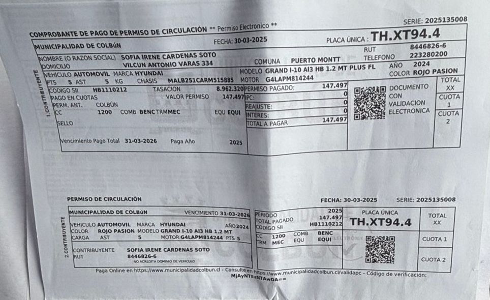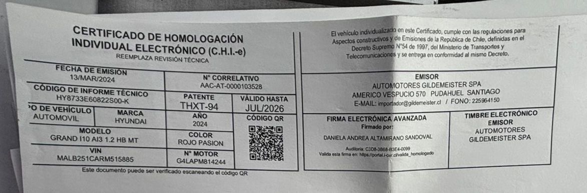 AUTOMOVIL HYUNDAI GRAND I10 AI3 HB MT 1.2 AÑO 2024 PATENTE THXT.94-4